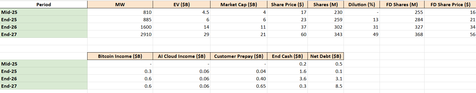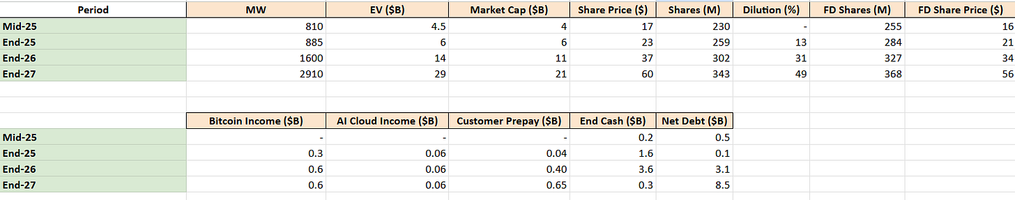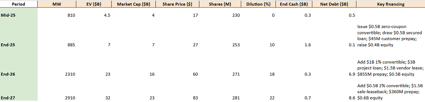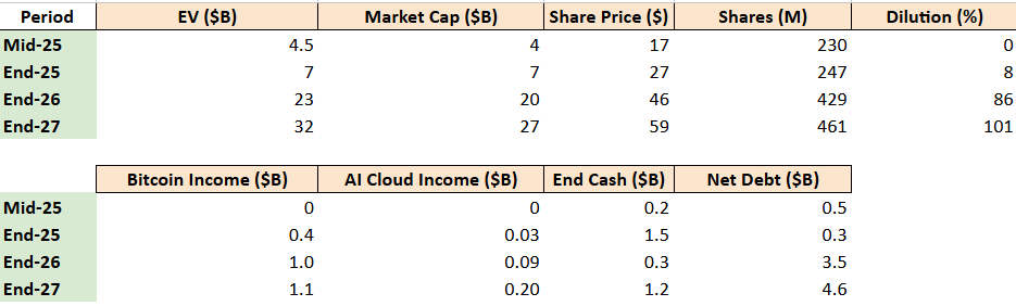 This enterprise value includes both the market cap and the net debt. So after you get diluted, as an investor, what could be your return? Let’s say IREN has to take on $2.5B in debt and dilutes 100% of their shares. As an investor, you’d see your returns more than cut in half.