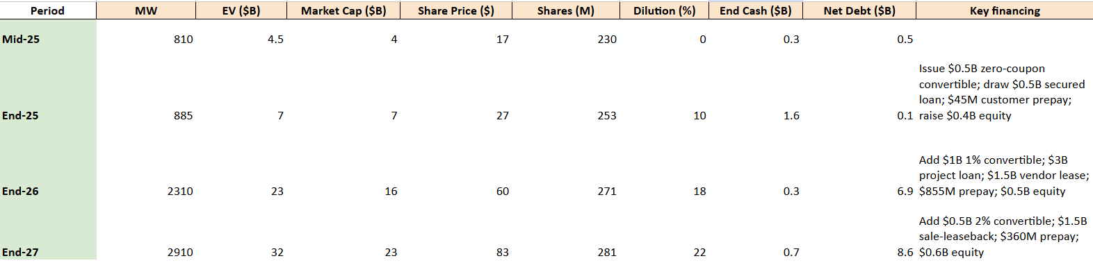 A more simplistic and less bullish approach, relying heavily on equity raises and assuming no alternative financing structures (no vendor financing, no sale‑leasebacks, no project loans). This leads to higher dilution even though the final enterprise value is the same.