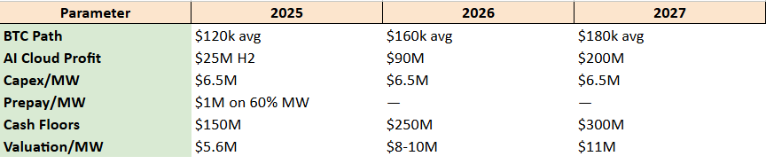 Build‑out: ~3 GW online; MW valuation assumed to step $5.6 M → $11 M by 2027