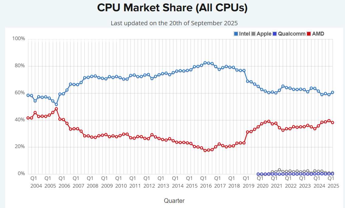 As the industry entered 2025, AMD was on an upswing across several markets. In CPUs, AMD’s Zen architecture steadily eroded Intel’s dominance in both consumer and server segments, gaining market share with strong price-performance and innovations such as chiplet designs and 3D-stacked cache.