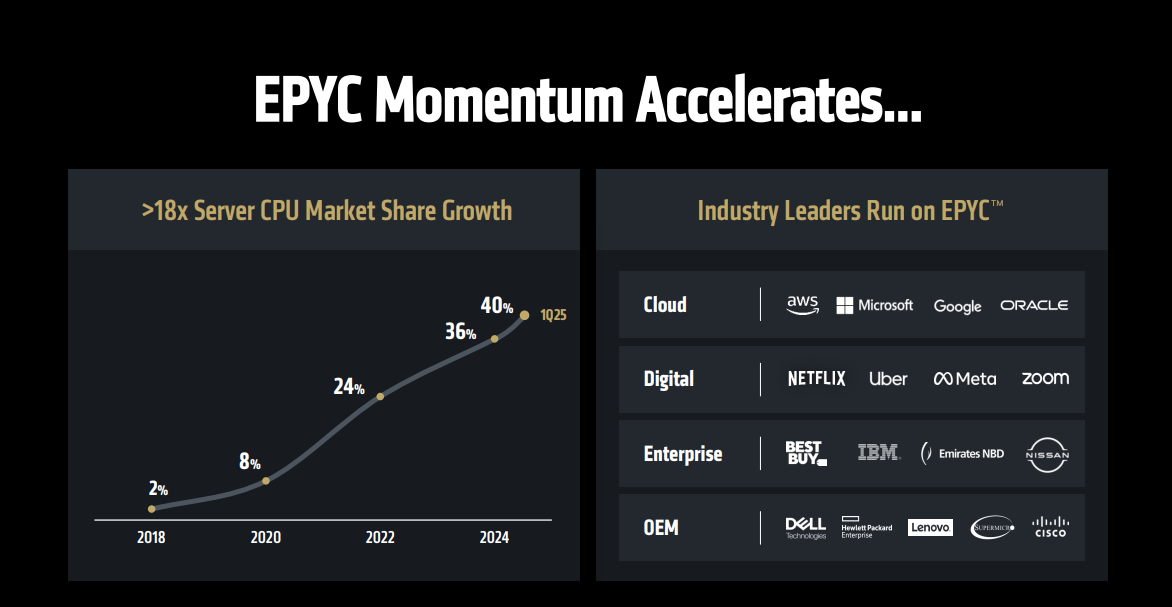 Over the last several years, AMD’s EPYC processors steadily eroded Intel’s dominance in the CPU market. AMD now holds more than 40% of server CPU share, driven by EPYC’s core density and efficiency advantages, particularly in cloud and hyperscale deployments.