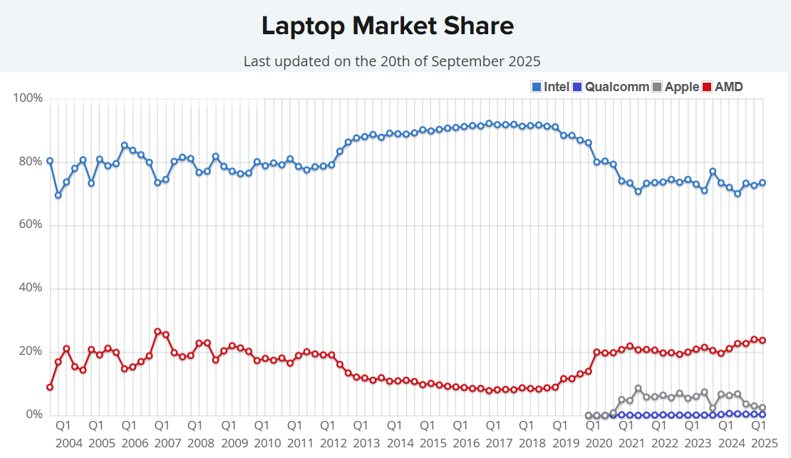 AMD captured roughly 20–25% of the laptop CPU market, helped by its integrated Radeon GPUs winning designs in ultrathins and gaming laptops.