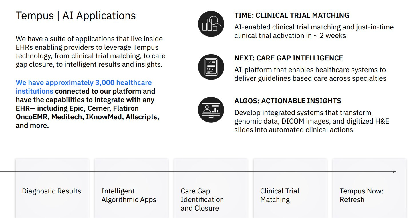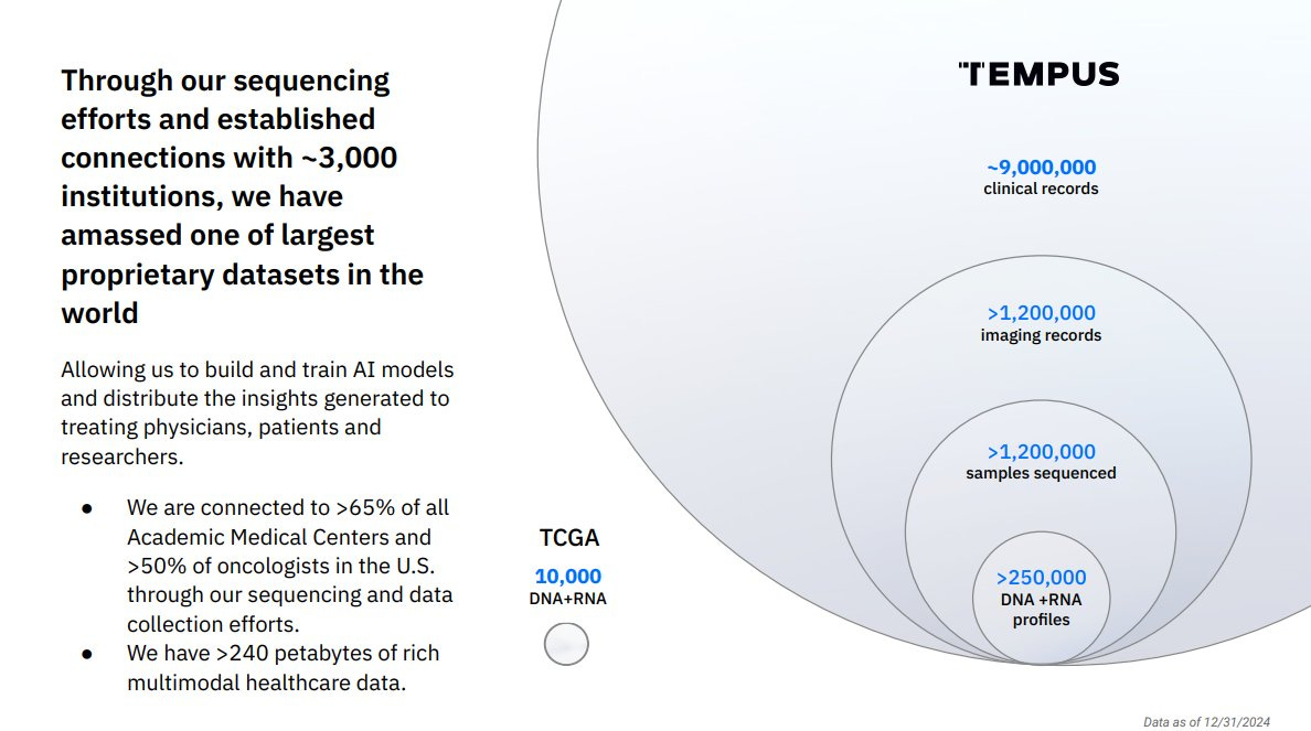 Tempus isn’t just a software company with a large data repository. It goes well beyond that. They’re already embedded within the healthcare system, giving them access to real-time data that continuously improves their AI models.